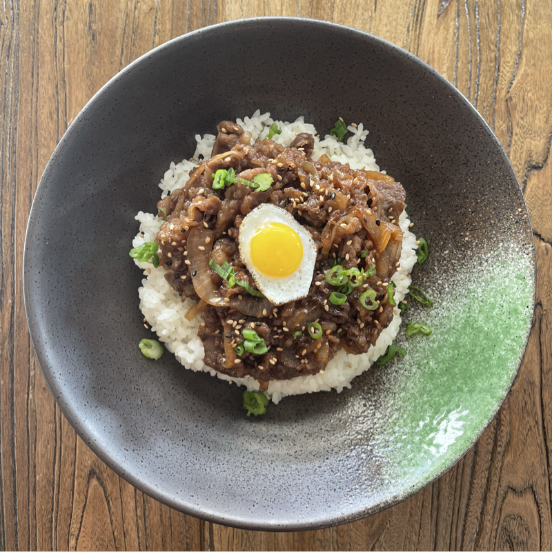Thinly sliced beef, onions, scallions, toasted sesame seeds topped with a quail egg.